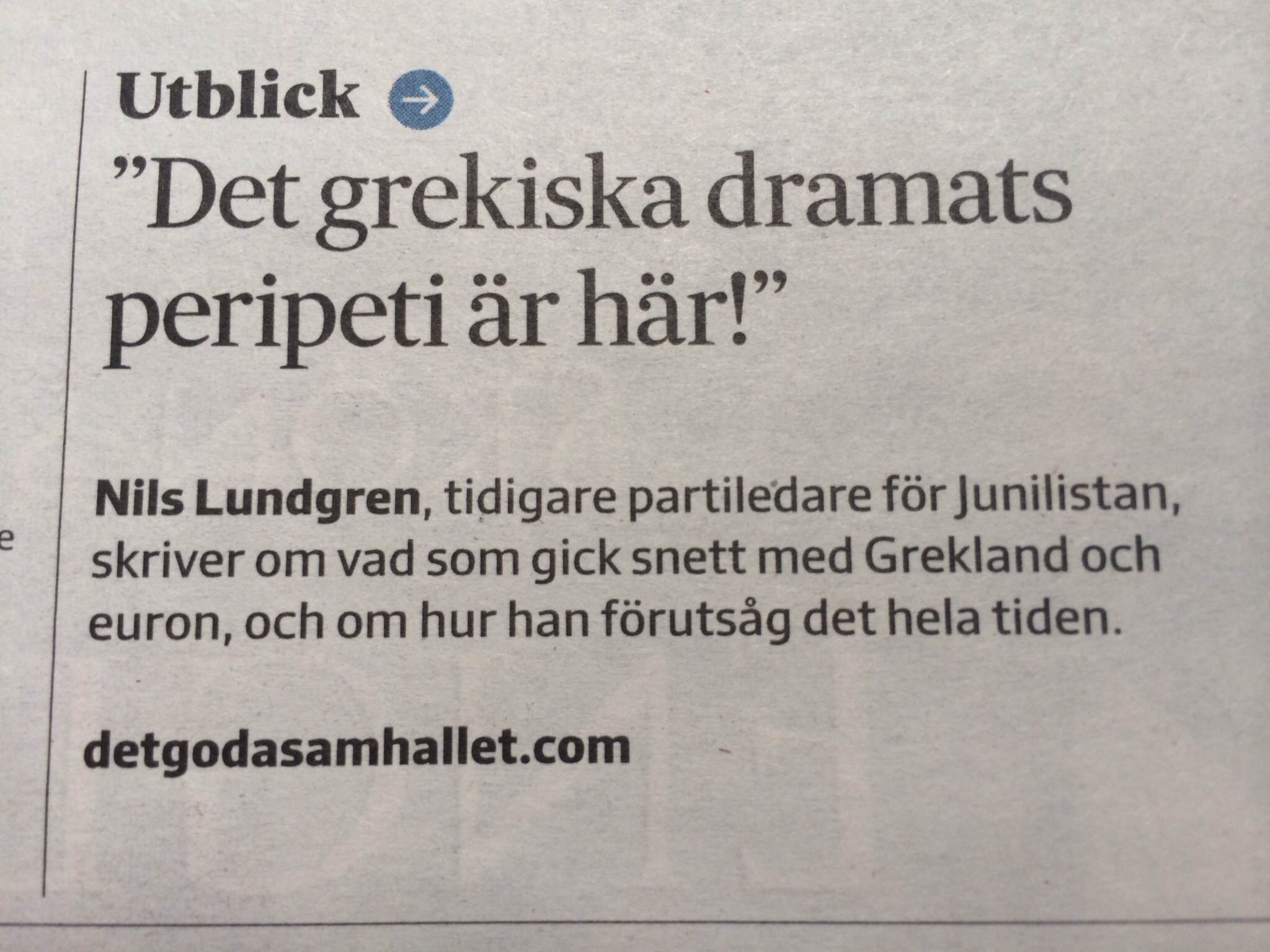 Nils Lundgrens artikel, Det grekiska dramats peripeti är här!, som behandlar Greklands ekonomiska situation, uppmärksammades nyligen på Svenska Dagbladets ledarsida.