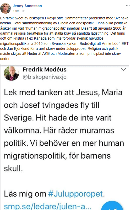 ”En färsk tweet av biskopen i Växjö stift. Sammanfattar problemet med Svenska kyrkan. Total sammanblandning av Bibeln och dagspolitik. Finns olika politiska åsikter om vad ’human migrationspolitik’ innebär! Bisarrt att använda 2000 år gammal religiös berättelse för att ställa krav på samtida lagstiftning. Det finns gott om kristna i t ex Kanada som inte förordar svensk huvudlös migrationspolitik a la 2015 som Svenska kyrkan. Bedrövligt att Annie Lööf, EBT och Jan Björklund förra året skrev under Juluppropet. Religion och politik måste skiljas åt! Heder åt AKB och Moderaterna som principfast inte skrev under.”