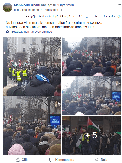 På Khalfis Facebookkonto kan man också hitta bilder från en antiisraelisk demonstration i Stockholm den 9 december förra året. Man protesterade mot att Trump erkänt Jerusalem som Israels huvudstad. På demonstrationen ropade man Allahu akbar och brände den israeliska flaggan. Man skanderade också ramsan ”Khaybar, Khaybar ya yahud, jaysh Muhammed saufa ya’oud!”