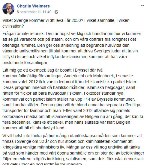 Idag, sjutton år efter attackerna, är ännu ett tillfälle att besinna konsekvenserna av an ansvarslös massinvandring från Afrika och Mellanöstern. Den före detta kristdemokraten Charlie Weimers skrev strax före valet , den 6 september, ett mycket starkt inlägg på Facebook där han motiverar sin övergång till Sverigedemokraterna. Han bad oss titta framåt och föreställa oss framtidens Sverige. I vilket Sverige kommer vi att leva om de demografiska trenderna håller i sig?