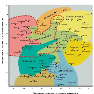För drygt ett år sedan skrev jag om medskam, ett mycket levande begrepp i finskan. I svenskan finns det inte. Vad kan det bero på? Kanske är skälet att vi är så mycket mer individualistiska? Och visst, som man kan se på kartan nedan, är skillnad mellan länderna. Ändå ligger båda länderna i det nordöstra hörnet av World Value Studies.