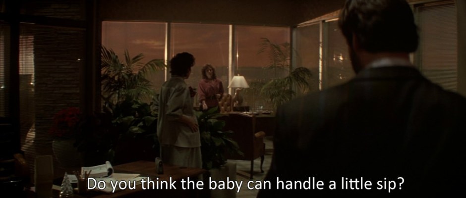 John röker ständigt och det är inte det enda som framstår som aningen förlegat år 2018. En av kontoristerna som jobbar åt Holly på Nakatomi vill sluta tidigt eftersom det är jul. Det får hon för Holly vill ju inte känna sig som Scrooge. Kontoristen är gravid och frågar Holly om hon tror att det är okej att dricka champagne. Ja visst, svarar Holly, din bebis klarar att stå i baren (ready to tend bar). Det vill säga: gå och drick och var glad!