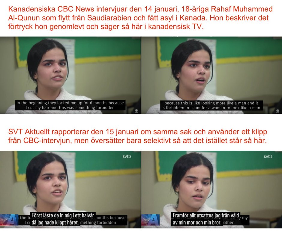 I går den 16 januari fick jag se något på USA-kännaren och den konservative poddaren Ronie Berggrens Facebooksida. På kanadensiska CBC den 14 januari berättade Rahaf sin historia. Men när SVT spelar upp klippet dagen därpå ser det inte likadant ut.