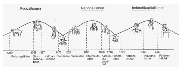 Nu till den andra delvis överlappande omläsningen. I den här sammanfattande bilden från min historiebok redovisas de elva svenska historiska epokerna sedan mitten av 1200-talet.