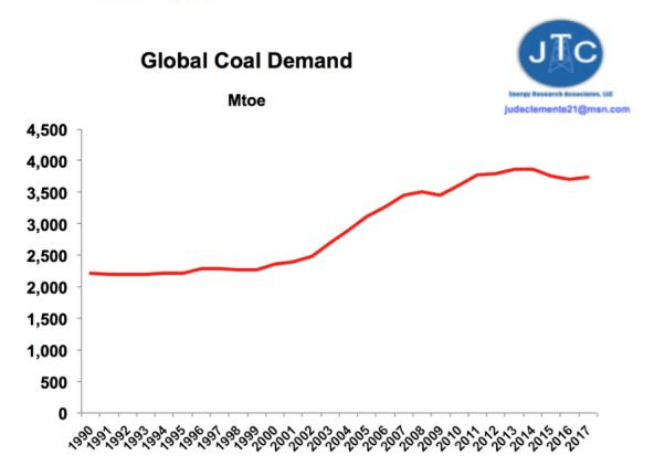 Så här ser efterfrågan på kol ut 1990 – 2017 (uppgifterna för 2018 är inte klara än):