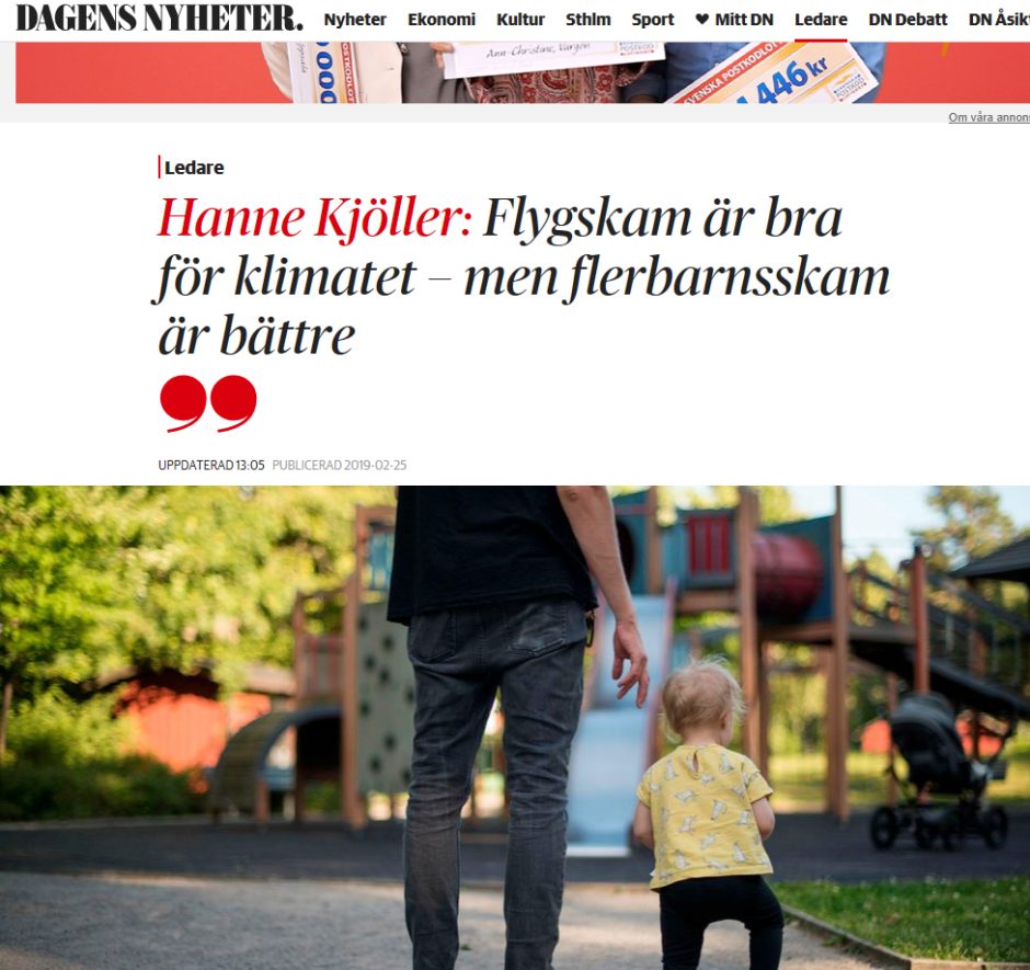 Bengtsson noterar att klimatisterna nu även vill skambelägga barnafödande. I en krönika i Dagens Nyheter introducerar Hanne Kjöller uttrycket ”flerbarnsskam”. Ju färre människor, argumenterar hon, desto mindre utsläpp. Ett barn kostar nästan 60 ton koldioxid, medan en flygresa kostar 2 ton.