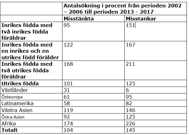 Både när det gäller antalet misstänkta och antalet misstankar är det folk födda i Afrika som toppar listan tätt följda av sverigefödda med två i utlandet födda föräldrar.