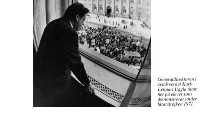 En pojke från gymnasiet, som var något mer politiskt medveten än vi, dök upp på skolgården och delade ut flygblad. Snart var jag inbegripen i mitt livs första demonstrationståg. Bärande på plakat där det stod att vi var ”tredje part” och ”oskyldigt drabbade” marscherade vi mot stadshuset, samtidigt som det ropades käcka slagord om ”Herr Uggla” – vilket möjligtvis kan ha syftat på Arbetsgivarverkets generaldirektör Karl Lennart Uggla, som här syns blicka ner mot en skara demonstranter (dock inte från min stad).