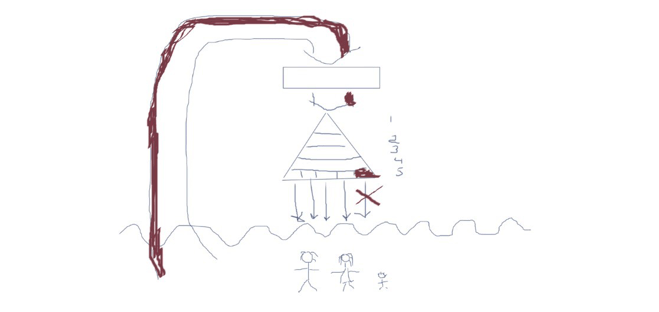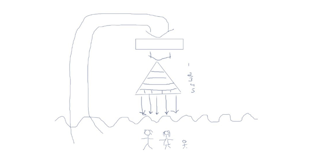 Det är samma bild som den förra med skillnaden att apparaten är indelad i fem nivåer. Anslagen från politikerna rinner ned uppifrån. Först hamnar de på nivå nummer 1. Tjänstemännen på den nivån räknar pengarna och drar bort vad de själva behöver och skickar resten till nivå nummer 2. Så fortsätter det att rinna pengar nedåt i apparaten. Goda år räcker anslagen även till löner för dem som jobbar längst ned i direkt kontakt med skattebetalarna och det övriga folket.