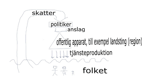 Längst ned finns folkhavet som jag ritat vågigt så att du ska fatta att det är ett hav. Folket betalar skatt till politiker som delar ut anslag till diverse förvaltningar, till exempel Västra Götalandsregionen eller skolförvaltningen i Håby kommun.