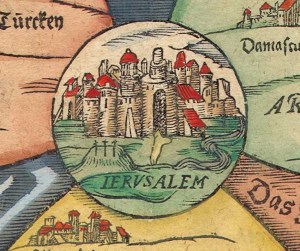 Den tyske geografen Heinrich Bünting illustrerade världen symboliskt som ett treklöver med Jerusalem i mitten. Kartan trycktes år 1581: