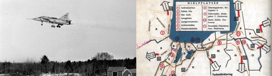BILD: Stridsflygplanet Viggen 1967 och en utrymningsplan från civilförsvarsövningen Operation Stockholm 1961.
