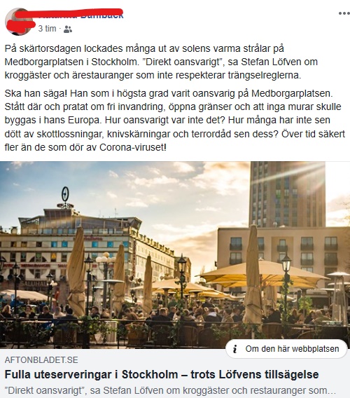 Ska han säga! Han som i högsta grad varit oansvarig på Medborgarplatsen. Stått där och pratat om fri invandring, öppna gränser och att inga murar skulle byggas i hans Europa. Hur oansvarigt var inte det? Hur många har inte sen dött av skottlossningar, knivskärningar och terrordåd sen dess? Över tid säkert fler än de som dör av Corona-viruset!
