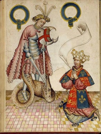 Englands härold eller ”vapenkonung” William Bruges (1375-1450) knäböjer inför drakdödaren Sankt Göran, nationens skyddshelgon: