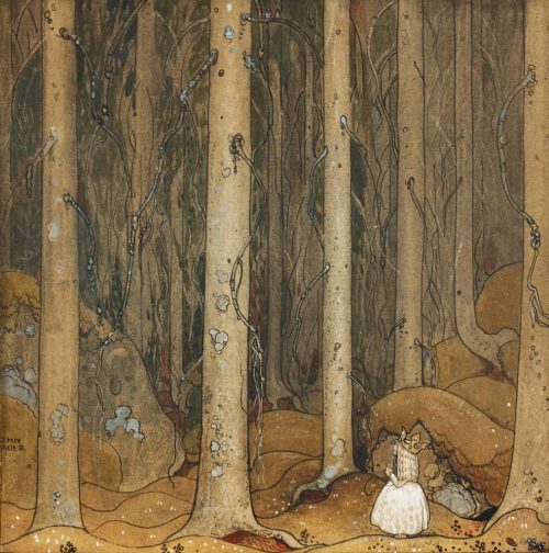 En fin skildring av den emotiva gesten finns i John Bauers teckning från 1912: ”Här är skönt och vackert, sade hon och slog ihop händerna”. Teckningen illustrerar Helena Nybloms saga ”Oskuldens vandring” om den lilla oskuldsfulla prinsessan Bellas vandring genom skogen. Flickan med blont lockigt hår och krona på huvudet (som en liten Lucia!) lyssnar till trädens sus. Hon är ensam, men inte rädd för mörkret runtomkring. ”Här är skönt och vackert, sa hon och slog ihop händerna”.