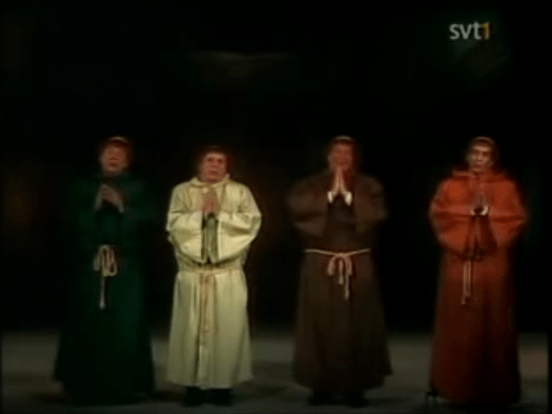 Ett exempel är denna stillbild från YouTube ur Casinorevyns nummer ”Då tar vi tagelskjortan på” eller ”Munkvisan”.