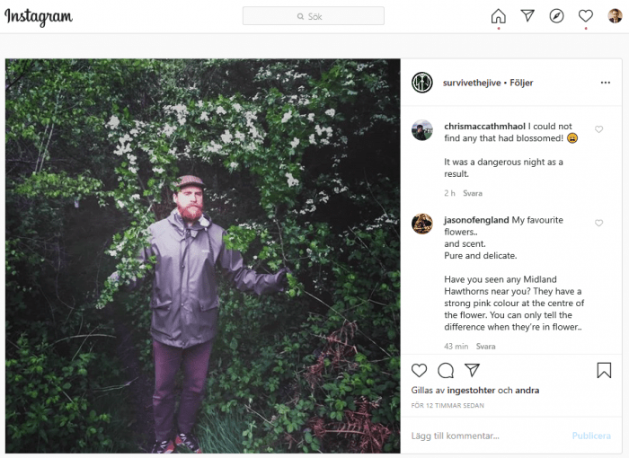 Den populäre engelske historikern och youtubern Tom Rowsell postade en bild på sig själv på Instagram när han plockade hagtorn: