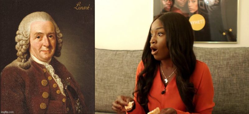 Först på tur står Carl von Linné, som hon anser ligger bakom rasbiologin. Han var vit, han var man och han ansåg att européer och afrikaner har olika egenskaper. Att Carl von Linné är betydligt mer känd för att ha katalogiserat växt- och djurriket, och i och med detta tillfört världen enormt betydelsefull kunskap, spelar givetvis ingen roll i sammanhanget.