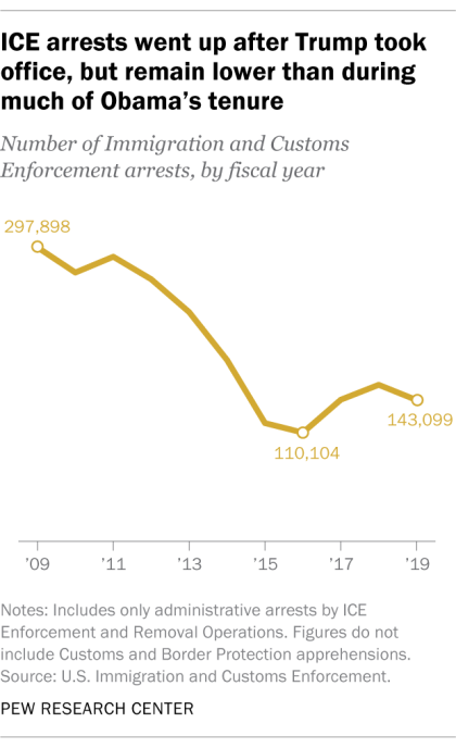 Däremot är det noterbart att antalet som utvisas från USA faktiskt var lägre år 2018 (sista året som det finns data för) än under 2013 då utvisningarna toppade under Obama. Faktum är att 2018 såg i princip samma antal utvisningar som 2016, sista året då Obama var president. Om gränspolisen misslyckas med att stoppa en illegal invandrare från att ta sig över gränsen, så faller uppgiften på ICE – Immigration and Customs Enforcement – som är den amerikanska myndighet som är ansvarig för inre utlänningskontroll. Trump har lovordat ICE, och med all rätt försvarat organisationen från orättvisa attacker, men faktum är att antalet illegala invandrare som arresterades av ICE år 2019 var lägre än det var år 2014 eller något tidigare år under Obamas presidentskap. Trenden är dessutom sviktande, med färre arresterade år 2019 än 2018!