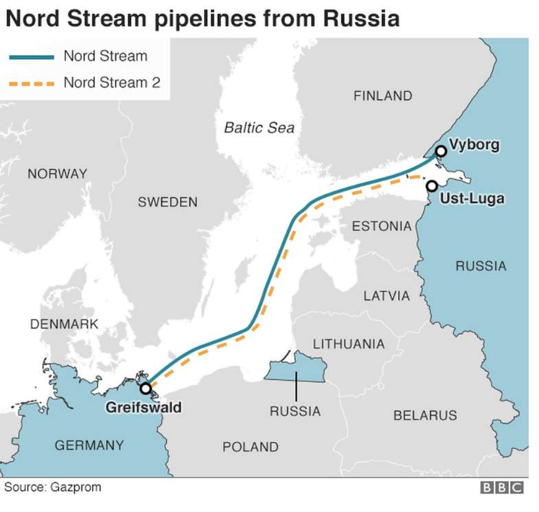 Denna dramatiska händelseutveckling just utanför den svenska knuten har jag inte läst om i svenska tidningar vilket kan bero på bristande uppmärksamhet från min sida. Jag blev uppmärksammad på saken av en granne som jobbar för tysk kemiindustri. Hon är orolig för att saken eskalerar bortom kontroll. USA har deklarerat sin position i flera år och Tyskland har inte tagit det på allvar utan bara betraktat den amerikanska inställningen som ett försök att sälja dyr flytande gas. Inte underligt att det blir spänt mellan Trump och Merkel.