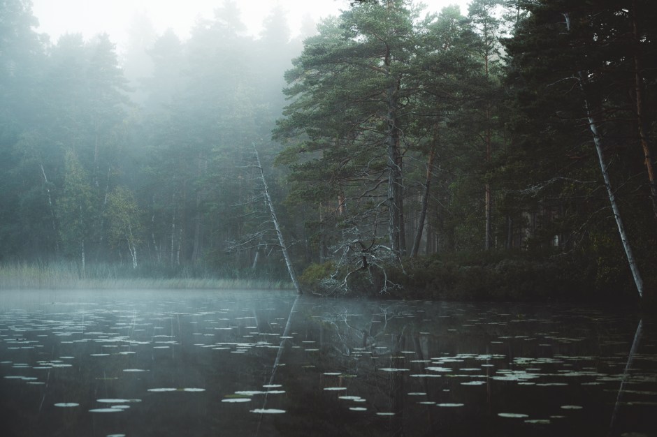 – Kan du beskriva med ord vad det är du försöker fånga med de videos du gör med drönare och där man ser en dimmig skog och mörka små gölar?
