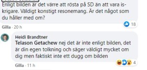På sitt Facebook-konto har Heidi lagt upp en meme som visar åtta skallar – sju mänskliga och en tillhörande en lägre primat. De sju mänskliga skallarna betecknas ”vit”, ”svart”, ”man”, ”kvinna”, ”IS-krigare”, ”bög”, ”Greta”. Och apskallen? ”Folk som röstar på SD”.