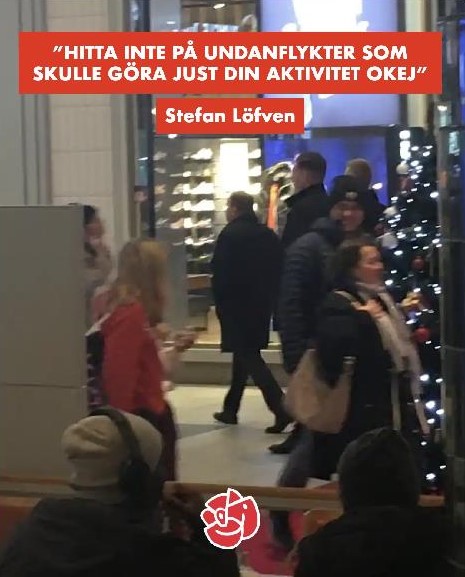 Har hållit det ena förmanande brandtalet efter det andra, inte minst om vikten av att undvika trängsel i shoppinggallerior – gick själv till Gallerian och andra butiker i Stockholm flera gånger under julruschen i december, bland annat dagen före julafton. Hans pressekreterare meddelar att det hela var ”planerat” – för resten av medborgarna har statsministern förklarat att detta skulle bli den jul då vi måste ändra våra planer.