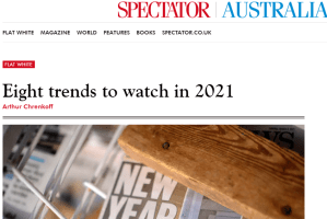 I den australiska utgåvan av tidningen Spectator (5/1 2021) radar skribenten Arthur Chrenkoff åtta trender som han anser att man bör bevaka under 2021, så som Israels situation i Mellanöstern, den kalla freden med Kina, teknoplutokratins framväxt och vänsterns radikalisering: