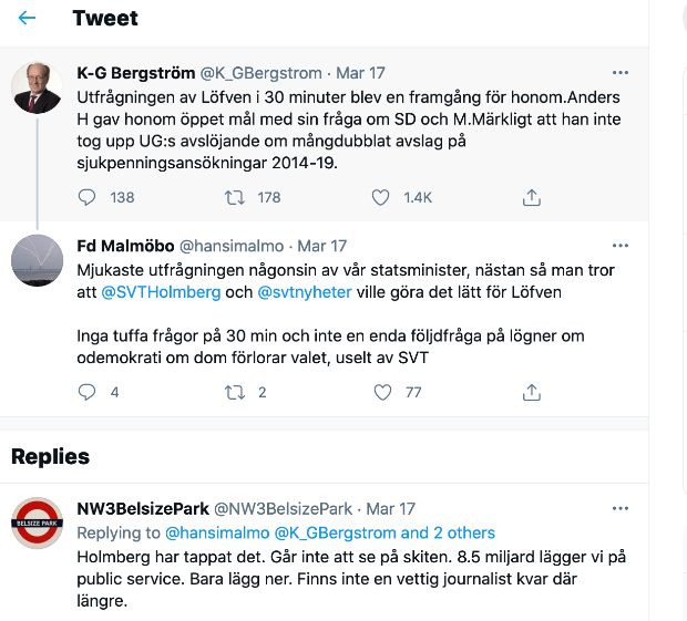 ”30 minuter”-intervjun med Stefan Löfven nyligen (17/3 2021) är ett gott exempel. Intervjuaren Anders Holmberg lät honom under 30 procent av programmet angripa och misstänkliggöra oppositionen, och att implicit hävda att ett regeringsskifte skulle vara ett hot mot demokratin. Trots att påståendena var häpnadsväckande och inbjöd att granska, så upprepades de flera gånger, i stort utan ifrågasättanden eller följdfrågor. Som K-G Bergström efteråt kommenterade på Twitter lämnades Löfven öppet mål.