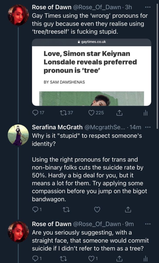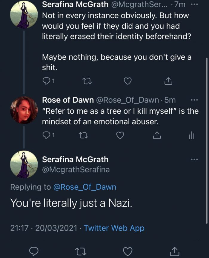 ”Rose of Dawn” stämplades då som ”nazist” av transaktivisten Serafina McGrath som menade att om man inte omtalar personer med det ”pronomen” som de själva har valt riskerar de att drabbas av depression och begå självmord: