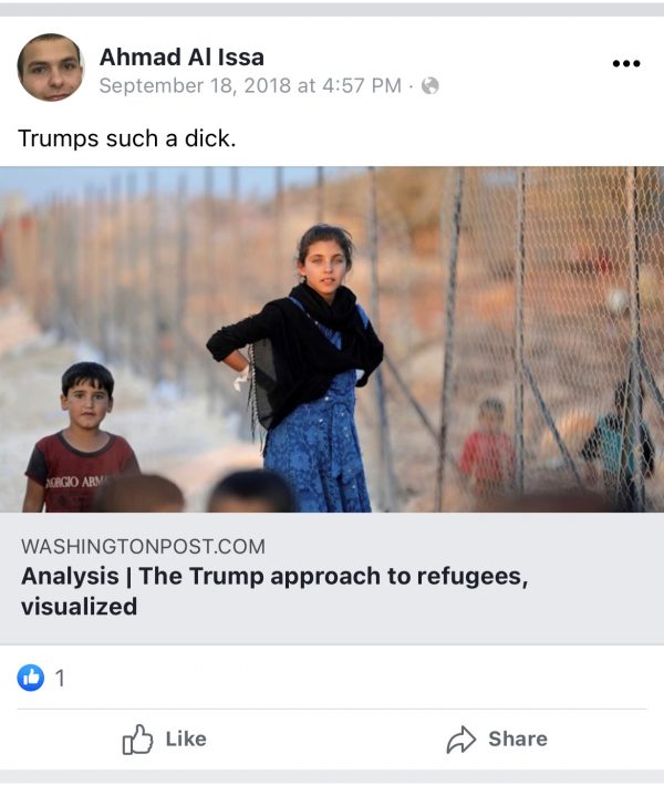 Ahmad Al-Issa delade även en artikel på Facebook med kommentaren ”Why refugees and immigrants are good for America” (Därför är flyktingar och invandrare bra för Amerika).