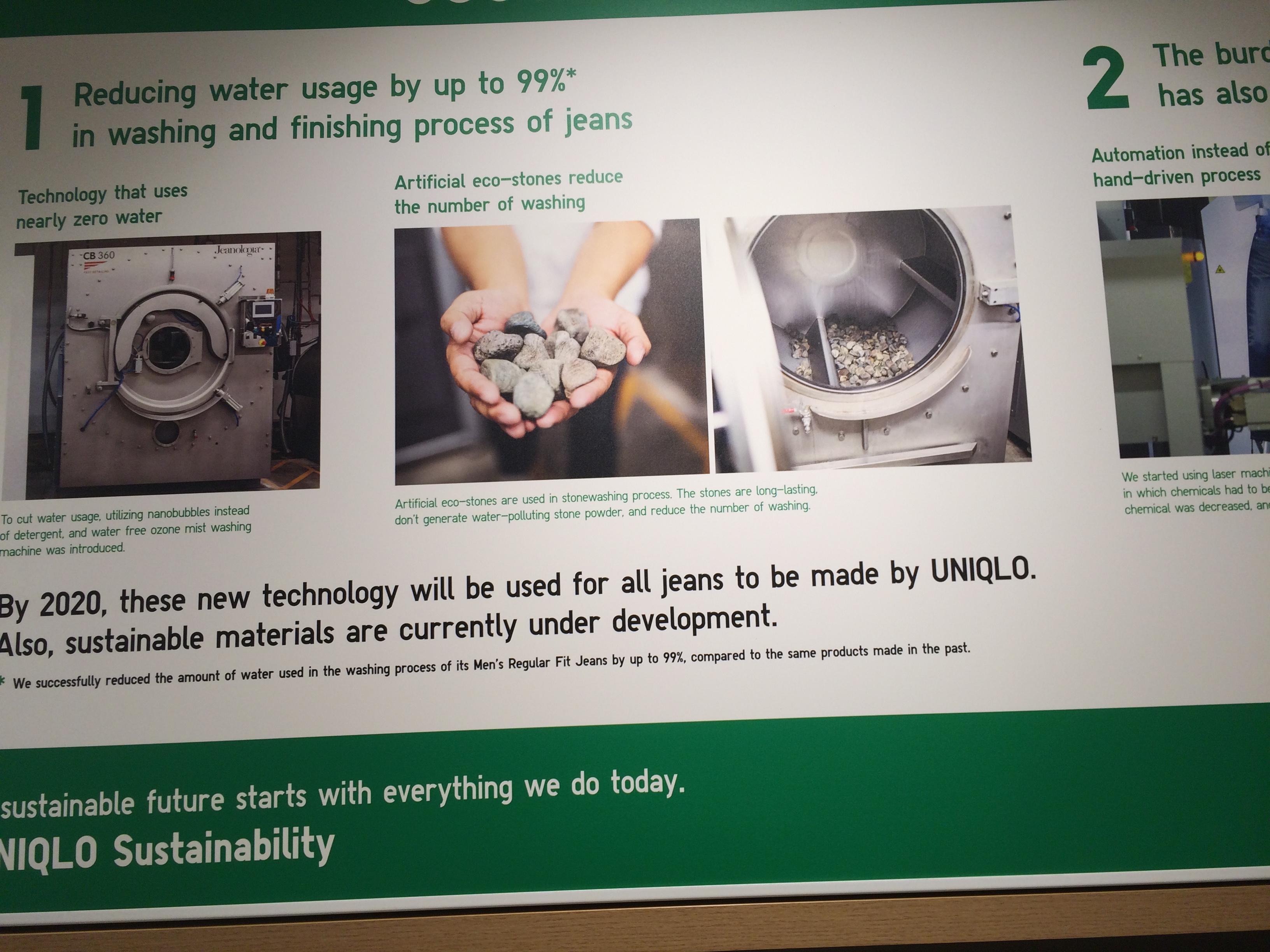 Begreppet hållbarhet hade plötsligt fått en helt annan innebörd. Uniqlos hållbarhetsstrategi handlade inte om att produkterna skulle vara hållbara utan att den för hållbarheten så totalt onödiga stentvätten skulle genomföras med hjälp av nya teknologier med minimal åtgång av vatten. Dessutom hade företaget uppfunnit en ny sorts ekologiska stenar som inte avger det stenpulver varmed dagens miljöfarliga denimstenar kan förorena vattendrag.
