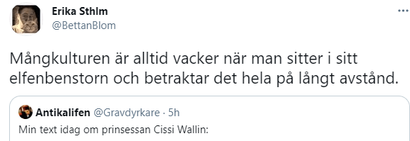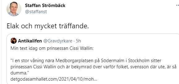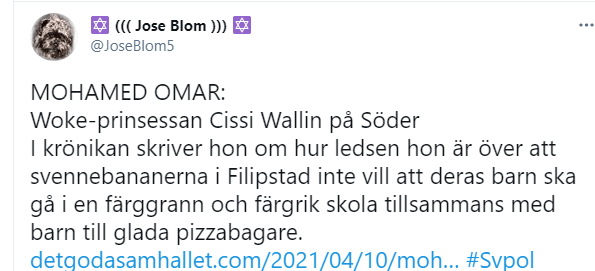 Den 10 april år publicerade Det Goda Samhället en satirisk artikel av Mohamed Omar. Artikeln är en replik på Cissi Wallins krönika i Expressen dagen före: ”Det får ni tugga i er, Svennebanan-föräldrar”.