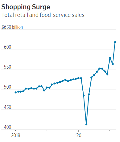 Bilden visar den amerikanska ekonomins fantastiska återtagningsförmåga i dessa dagar. Detaljhandelns omsättning ökar dramatiskt sedan coronatappet i början av 2020 som troligen förvärrades av de drastiska nedstängningar som genomfördes i åtskilliga delstater. Nu öppnas ekonomin i hela landet och folk börjar köpa för pengarna de sparat under den svåra tiden och som de fått i stimulansbidrag från staten (fast undersökningar visar att de bara köper för en liten del av de federala bidragen och i stället använder pengarna till att spara eller betala av på sina skulder). Företagen kan knappt hitta arbetskraft för att producera så det räcker till den svällande efterfrågan och BNP för 2021 väntas öka med 6,4 procent.