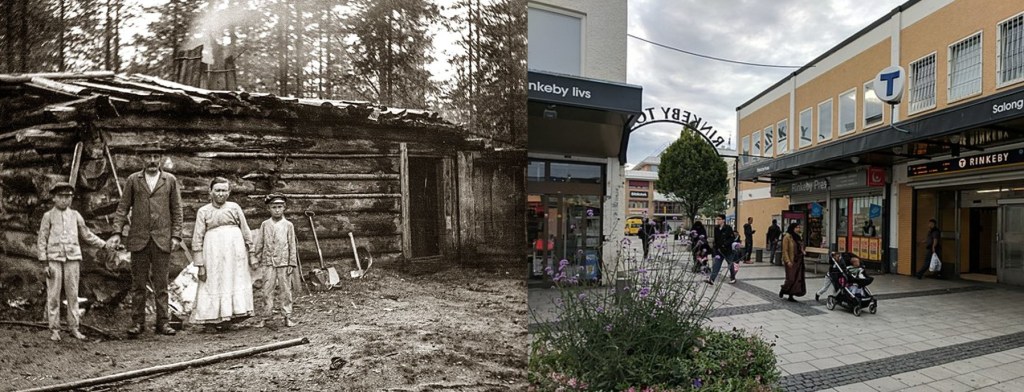BILD: 1) Svenska nybyggare i Norrland på 1800-talet, 2) Rinkeby idag.