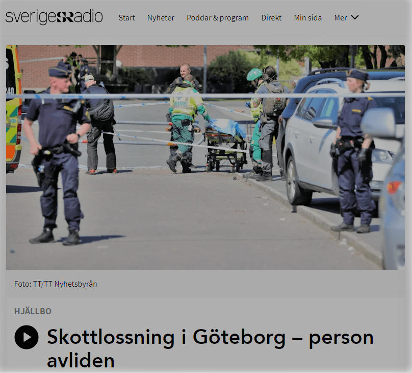 Söndag den 30 maj. En man sköts ihjäl i det mångkulturella utanförskapsområdet Hjällbo i Göteborg. Fyra skottskadade personer behandlas på sjukhus. Polisen menar att mordet är kopplat till ett våldsamt upplopp på fredagskvällen då två rivaliserande invandrarbakgrundsgäng drabbade samman. Ett hundratal män deltog i bråket.