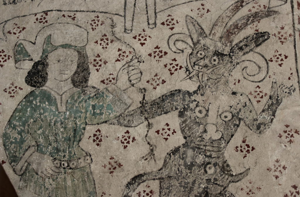 BILD: Djävulen leder bort en yngling, kalkmålning i Roslags-bros kyrkas kor.