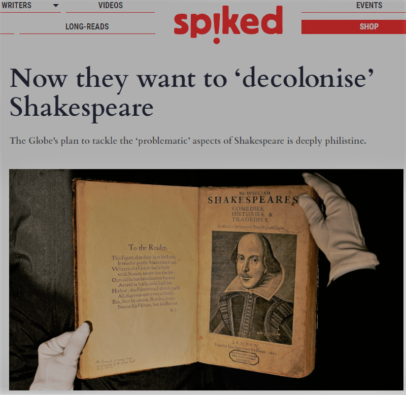 Vi som följt med i debatten är förstås inte särskilt förvånade. Det var ju bara en tidsfråga innan BLM-inspirerade akademiker, med för mycket tid och för mycket resurser till sitt förfogande, skulle börja tafsa på Shakespeare.