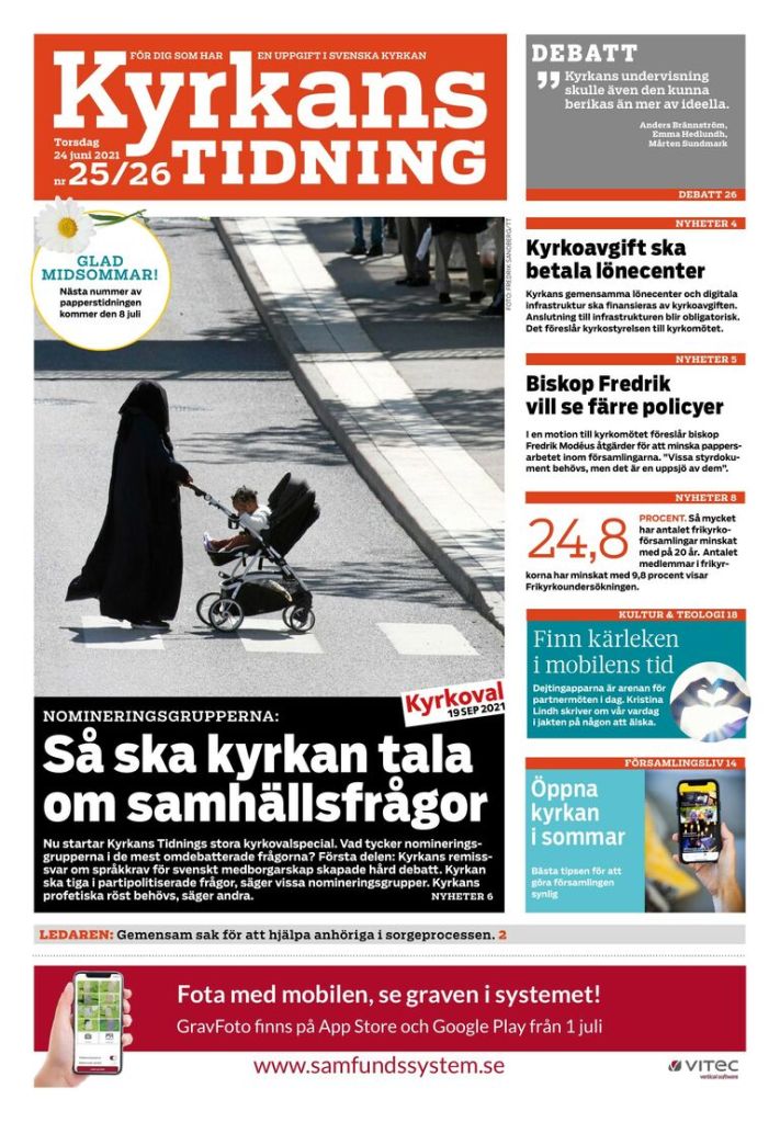 Inför midsommar passade Kyrkans Tidning på att skicka en midsommarhälsning till sina läsare – illustrerad med en bild på kvinna klädd i heltäckande religiös klädsel av den typ som kommit att förknippas med våldsam islamism. Lagom till den mest svenska av alla helger ser svenska kyrkan alltså till att inte bara lyfta en annan religion än den man själv företräder, utan dessutom normalisera en kvinnoförtryckande klädsel som inte hör hemma i ett modernt, västerländskt land.