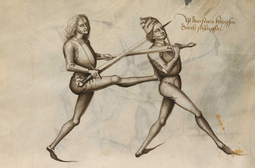 Men savate var inte den första europeiska kampkonsten som använde sparkar. En av de äldsta bevarade europeiska fäktningsmanualerna, publicerad 1410, skrevs av italienaren Fiore dei Liberi. I manualen förekommer förutom svärdstekniker även grepp och sparkar, som ni kan se på bilderna. Det är inga höga och spektakulära sparkar, utan de är menade att användas tillsammans med svärd som ett sätt att till exempel ta sig ur låsningar.
