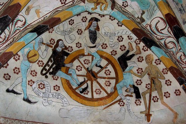 BILD: Livshjulet. Kyrkmålning från 1400-talet av Albertus Pictor. Härkeberga kyrka, Uppland.