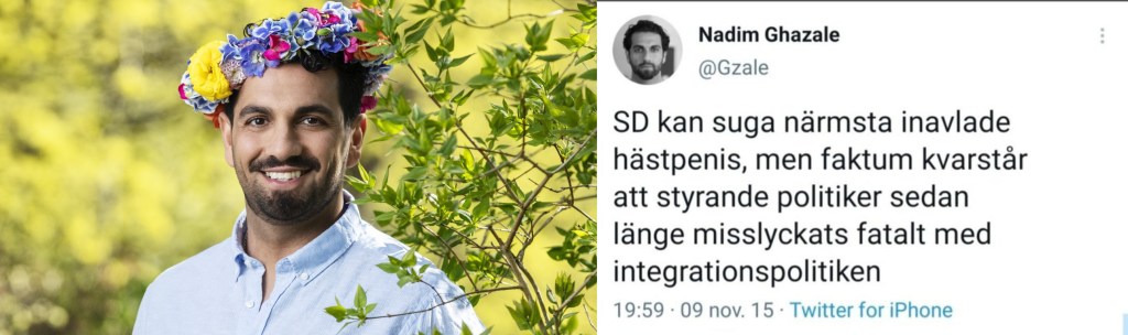 De tar heller inte upp vad Ghazale har twittrat om, utan kallar hans hatretorik för ”kritik mot Sverigedemokraterna”. Jag vet inte riktigt vad de har för språkbruk på Sveriges Radio, men att be folk suga inavlade hästpenisar brukar vanligen inte jämställas med ”kritik”.
