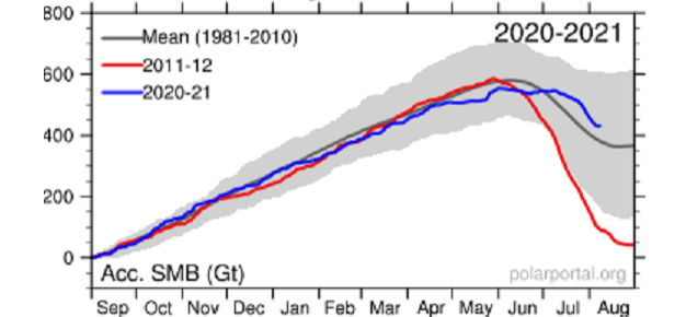 Not: Figuren ovan är uppdaterad 8 augusti och är från danska Polar portal, som är en officiell datakälla. Figuren finns återgiven här under fliken ”Acc”. Acc. SMB betyder Accumulated Surface Mass Balance och anges i gigaton. Data finns tillgängliga här. En publicerad forskningsrapport finns här.