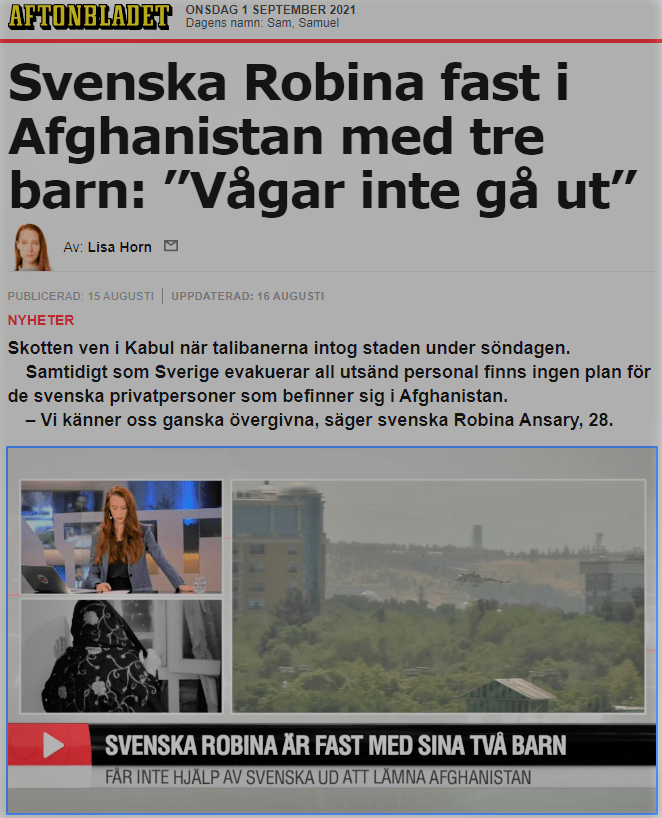 De senaste dagarna har medierna rapporterat om Robina Ansary, som kom från Afghanistan som flykting för 20 år sedan, och som befinner sig i Kabul med sin familj. Det är tredje gången hon besöker landet hon flydde ifrån, men att människor undrar över detta har hon uppenbarligen ingen förståelse för. Till Aftonbladet säger hon: