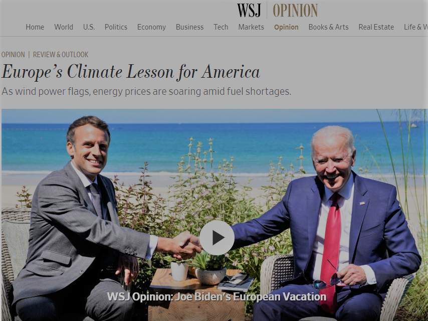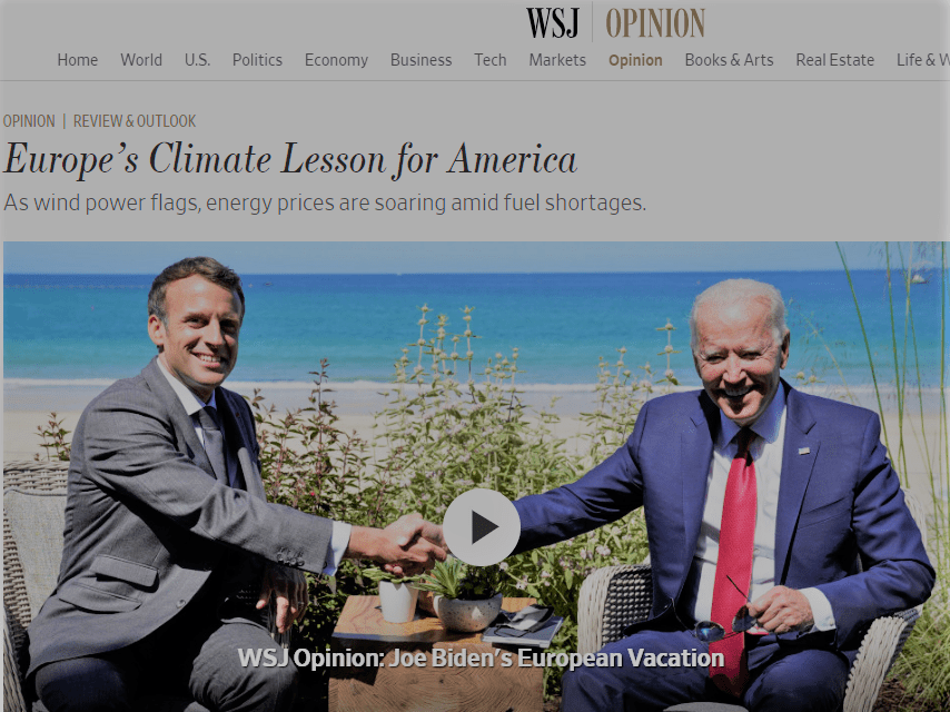 I en ledare i tidningen Wall Street Journal (14/9 2021) varnas Bidenadministrationen för att ta efter Europas antikoldioxidpolitik som lett till bränslebrist och stigande priser på energi.