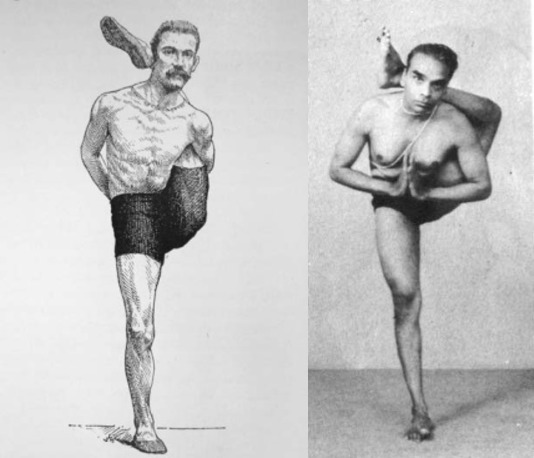BILD: 1) Illustration ur boken The Anatomy of a Contortionist (1889) av den amerikanske forskaren i anatomi Thomas Dwight (1843–1911), och 2) Den indiske yogaexperten B. K. S. Iyengar (1918-2014). Fotografi från 1966.