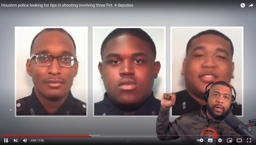 Brandon Tatum är en svart, konservativ youtuber som kommenterar nyheter. Hans kanal ”The Officer Tatum” har 1,72 miljoner prenumeranter. I en video den 19 oktober i år (2021) rapporterar han om tre svarta poliser som skjutits i Houston, Texas.
