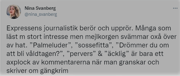 Ortengrabben Mehdis sadistiska tortyrvåldtäkt nämns inte med ett ord, och vi får ingen förklaring till mörkandet, i stället talar Olsson om Sverigedemokraternas ”otäcka” kultursyn. På Twitter intar Nina samma position: hon avfärdar kritiken som ”hat” och och försöker rikta uppmärksamheten mot ”hatarna”, underförstått gammelmedias fiender, ”populisterna”. Denna populism, som inte är något annat än (det ibland vulgärt uttryckta) missnöjet hos den produktiva delen av befolkningen som exploateras för att upprätthålla politikerväldet med vidhängande välfärdsindustriellt komplex.