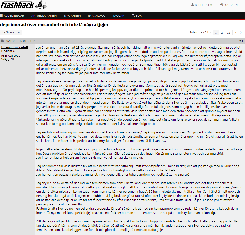 På Flashback hittade jag detta vittnesmål (21/8 2021) från en ung olycklig man. Hans öde är långt ifrån unikt. Jag umgås mycket med unga män och kan intyga att många delar samma erfarenheter. (Klicka på länken för att läsa texten på Flashback eller på bilden nedan för att förstora upp den).