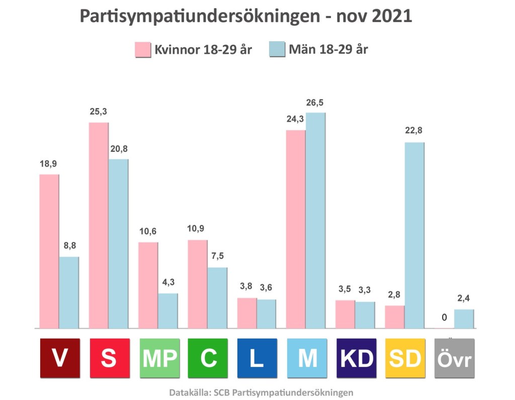 När SCB:s stora undersökning om partisympatier för november 2021 nyligen kom blev siffrorna ännu tydligare. (s.26-28) Fortfarande sympatiserar två tredjedelar av de unga kvinnorna med ”de rödgröna” c+mp+v+s medan motsvarande siffra hos unga män i samma åldersgrupp är strax över 40 procent, vilket är ungefär samma nivå som 2018. Men vad som verkligen sticker ut är de bristande sympatierna för Sverigedemokraterna. Mindre än tre procent av de unga kvinnorna känner att SD är det parti som ligger dem närmast medan motsvarande siffra hos de unga männen är uppemot 23 procent. Enligt SCB låg unga kvinnors SD-sympatier i november 2018 på drygt sju procent medan de unga männen hållit en tämligen konstant nivå sedan dess.